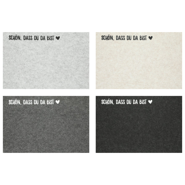 Material: 100% Polyester Filz 3mm Farbe:hellgrau, grau, anthrazit, creme Spruch bedruckt: Schön, dass du da bist B:45cm H:30cm T:0,03cm