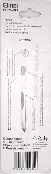Zahnbrste Elina Dentalset 10 teilig auf Karte Set besteht aus: Zahnbrste m.Zungenreiniger 18cm Zahnseide gewachst 15m und 8 Zahnpicks inkl. Schutzkappe fr ZB