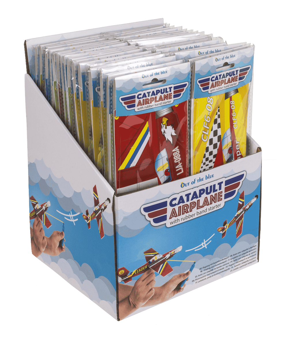 Flugzeug mit Gummibandkatapult, ca. 20 cm, aus Kunststoff, 8-fach sortiert, in Kunststoffbeutel, 36 Stück im Display