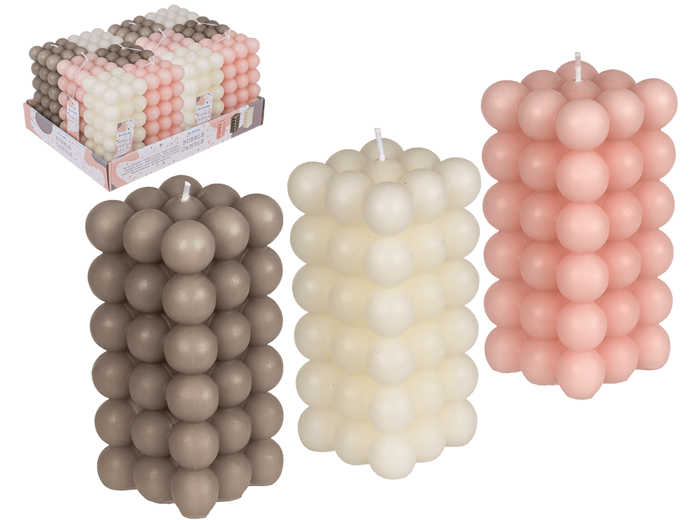 Kerze, Bubble, ca. 6 x 12 cm, 3-farbig sortiert, 12 Stück im Aufsteller