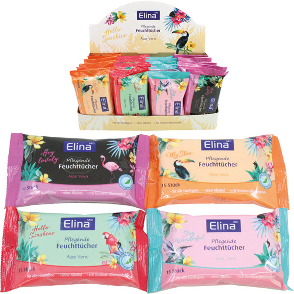 Feuchttücher 15er Elina Tuchgröße 18x12cm 4-fach sort., mit frischem Blumenduft im 32er Display , ohne Alkohol, für alle Hauttypen 40gsm