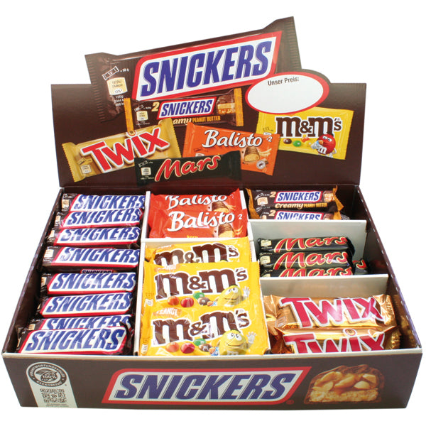 Food Mars Topsellerbox 72teilig 6fach sortiert 26x Snickers 50g, 8x Mars 46g, 8x Twix 50g, 10x Balisto Korn 37g, 12x M&M's Peanut 45g, 8x Snickers Creamy Peasnut Butter 36,5g MHD 25/06 [D]