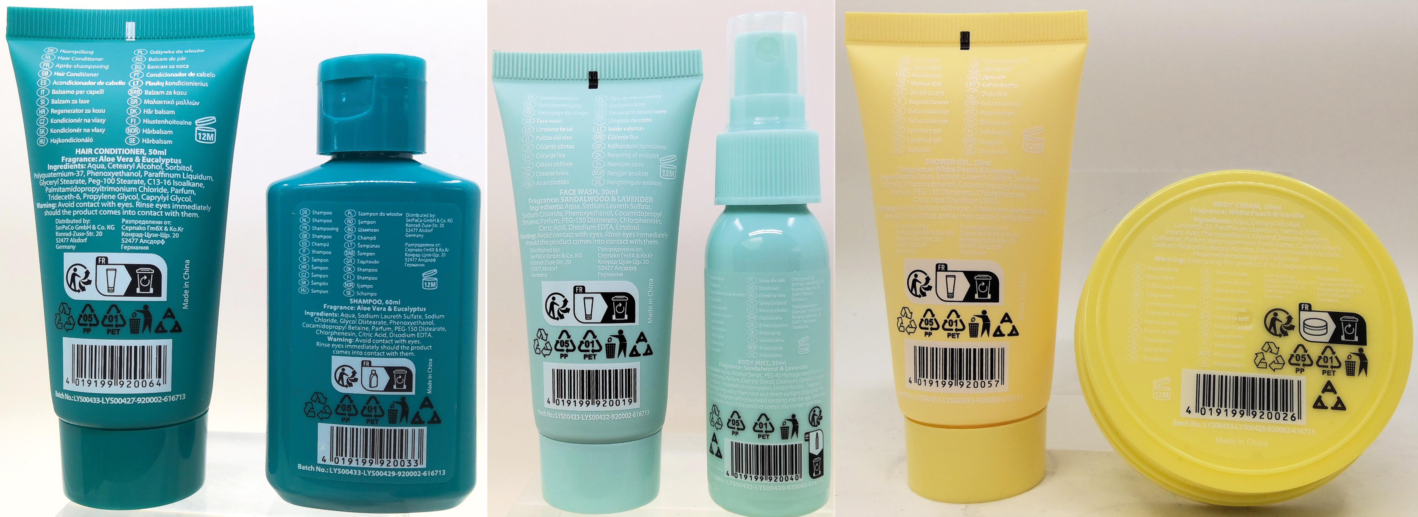 Cosmetics Travel Mini's Biodamore 6 assorted 8 x facial cleanser 30ml, body cream 50ml Shampoo 60ml, body spray 30ml, shower gel 50ml Hair conditioner 50ml