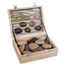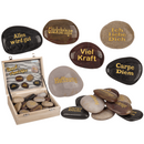 Handschmeichler aus polierten Natursteinen, ca. 4,5 cm, 6 Gravierungen, 24 Stück in Holzbox. Maße: 7,0x5,5x1,3 cm, Gewicht: 0,079 kg. Naturstein-Oberfläche, mehrfarbig.