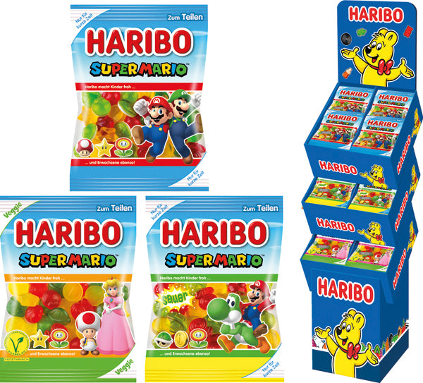 Food Haribo 175/160g "Super Mario" 146er Display 36x Super Mario Fruchtgummi, 34x Super Mario Sauer, 40x Super Mario Veggie, 36x Rainbow Pixel MHD 25/06